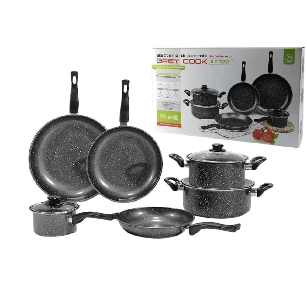 Scopri il set completo di pentole e padelle Grey Cook 9 pezzi: un must-have per chi desidera portare in cucina design moderno, praticità e qualità. Questo set batteria pentole e padelle 9 pezzi grey cook in acciaio al carbonio con rivestimento antiaderente effetto marmorizzato è pensato per chi ama cucinare in modo sano, leggero e senza rinunciare alla comodità.
