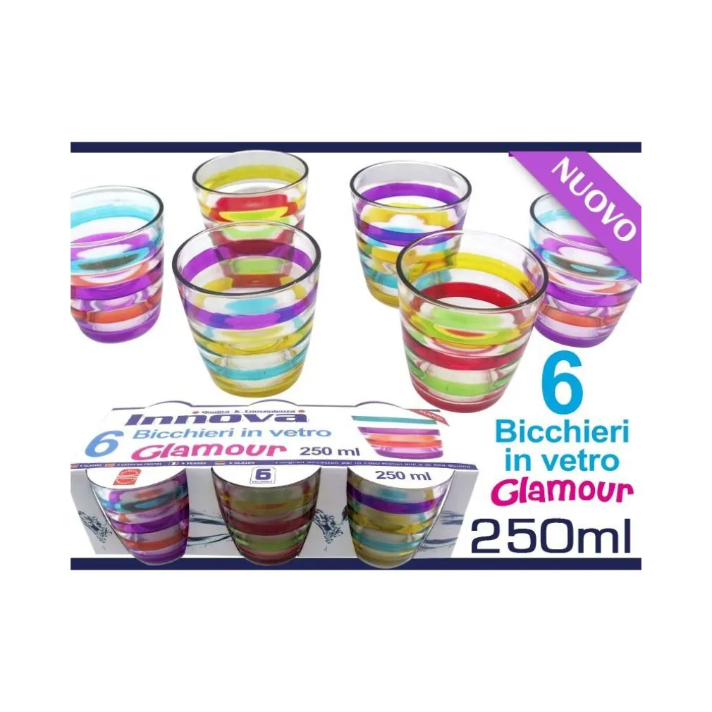 SET BICCHIERI IN VETRO CON RIGHE COLORATE GLAMOUR 6 PEZZI DA 250 ML COLORATI