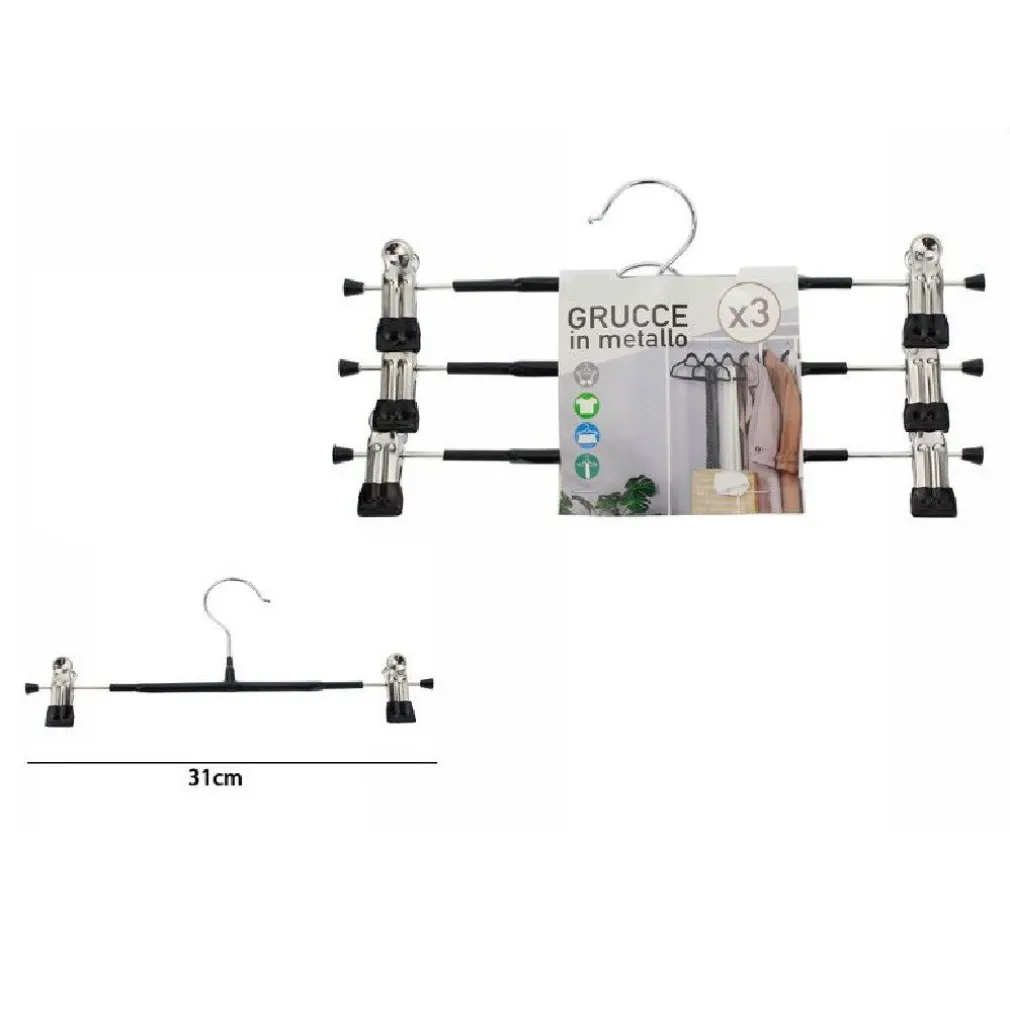 Mantenere un ordine corretto nello spogliatoio o nell’armadio è un fattore importante nell’organizzazione della vostra casa, per questo vi proponiamo il Set di 3 grucce in metallo con clip. Realizzate in metallo, materiale resistente e durevole, hanno una finitura metallica e nera che gli dona un tocco di stile industriale, ideali da abbinare a qualsiasi camera da letto. Si distingue per le sue dimensioni e il design che ti permetteranno di appendere una moltitudine di capi, occupando il minimo spazio.