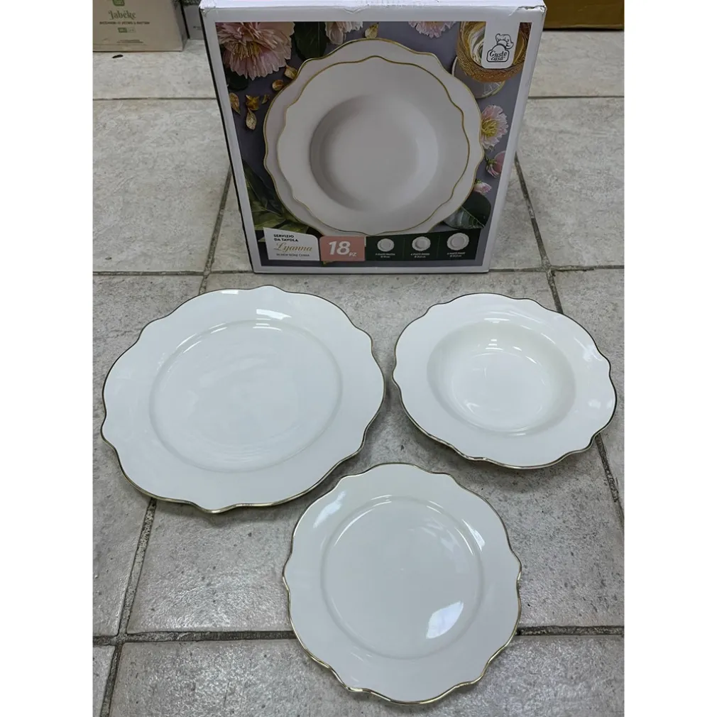 SET SERVIZIO DI PIATTI DA TAVOLA IN PORCELLANA 18PZ DESIGN ELEGANTE CON BORDI SMERLATI ORO –