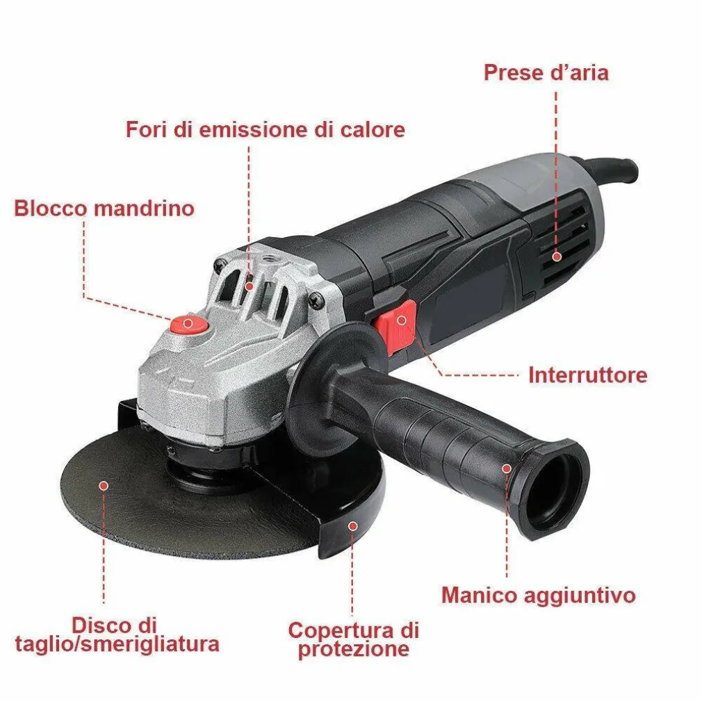 - Impugnatura antivibrante inclusa da poter installare su entrambi i lati della smerigliatrice