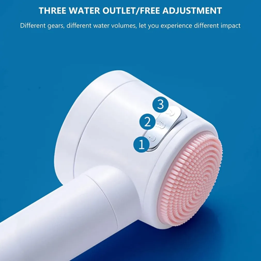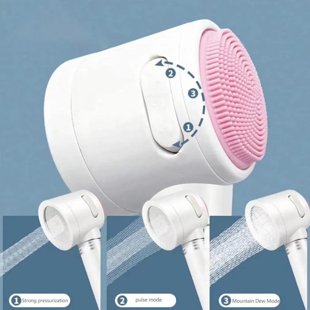 La parte anteriore è un normale soffione e puoi massaggiare con la parte in silicone rosa dietro. Il soffione è comodo da usare per strofinare la schiena e massaggiare.