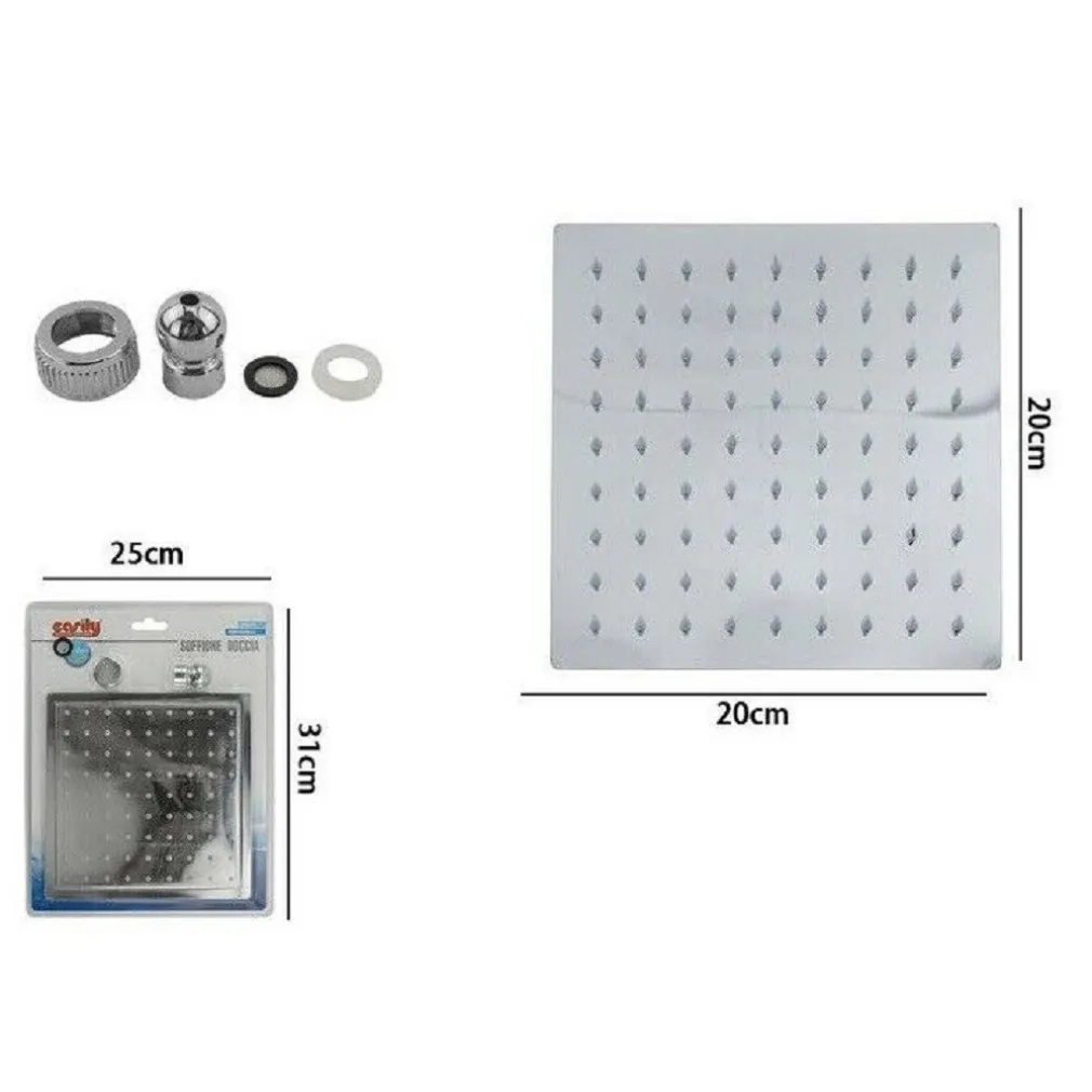Aggiungi un tocco di modernità e comfort al tuo bagno con il Soffione Doccia Quadrato 20 x 20 cm con Ugelli a Fori e Miscelatore. Trasforma ogni momento sotto la doccia in un’esperienza di lusso e relax.