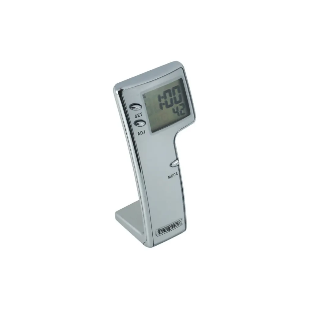 Orologio sveglia digitale da tavolo con indicazione dell’orario. Funzioni ora, data, sveglia e cronometro. Design esclusivo moderno dal colore argento.
