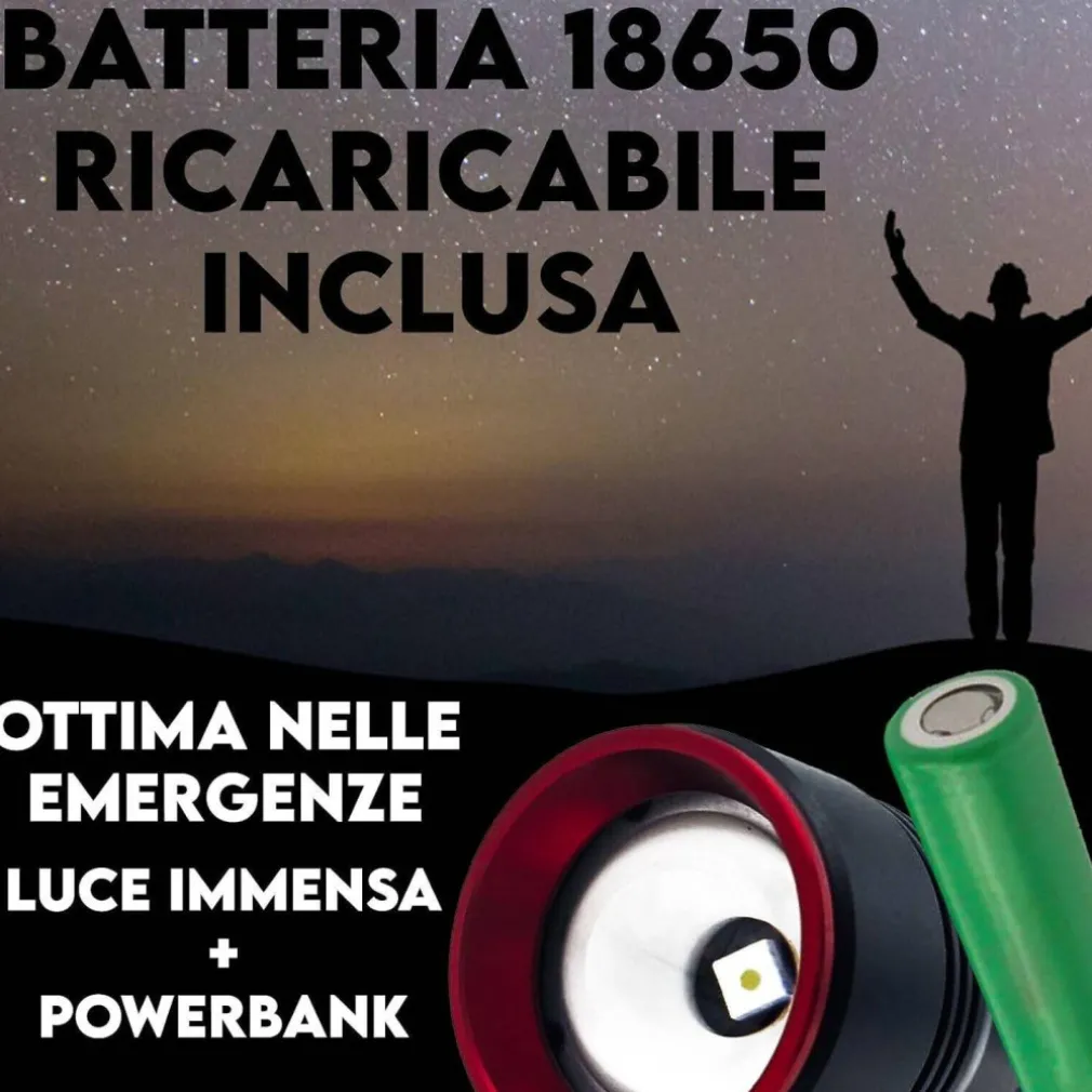 - Illuminazione potente fino a 500 metri, autonomia di 18,000 mAh, resistenza all’acqua, zoom regolabile, e ricarica rapida.