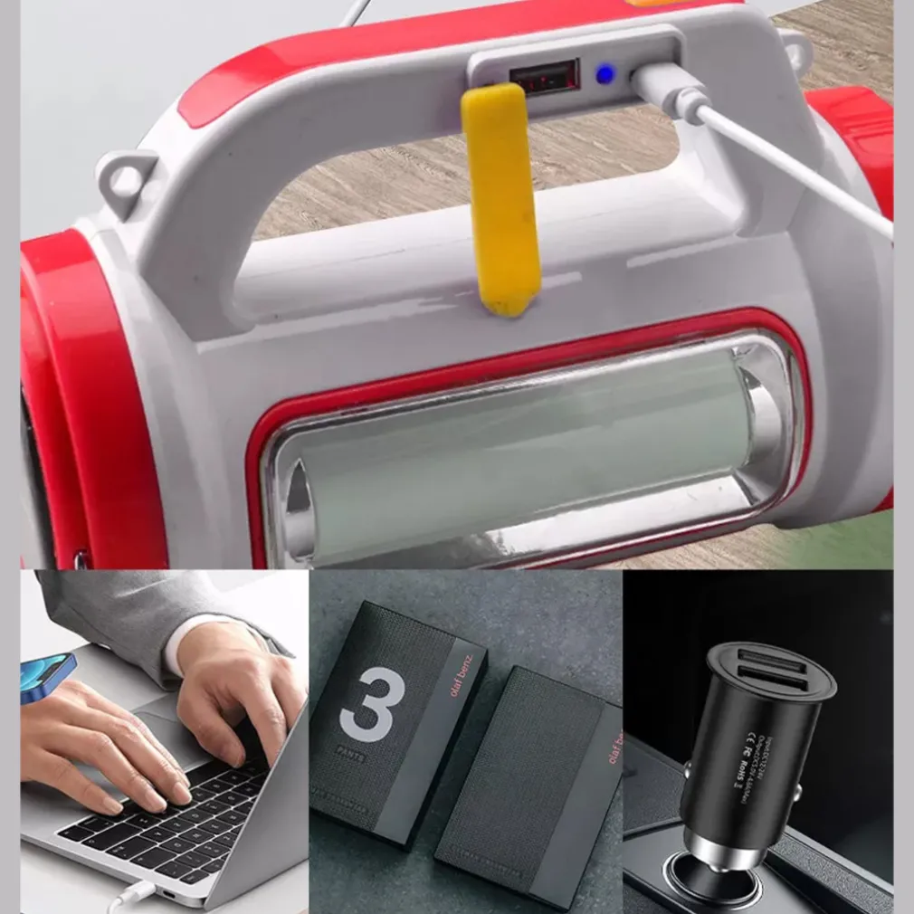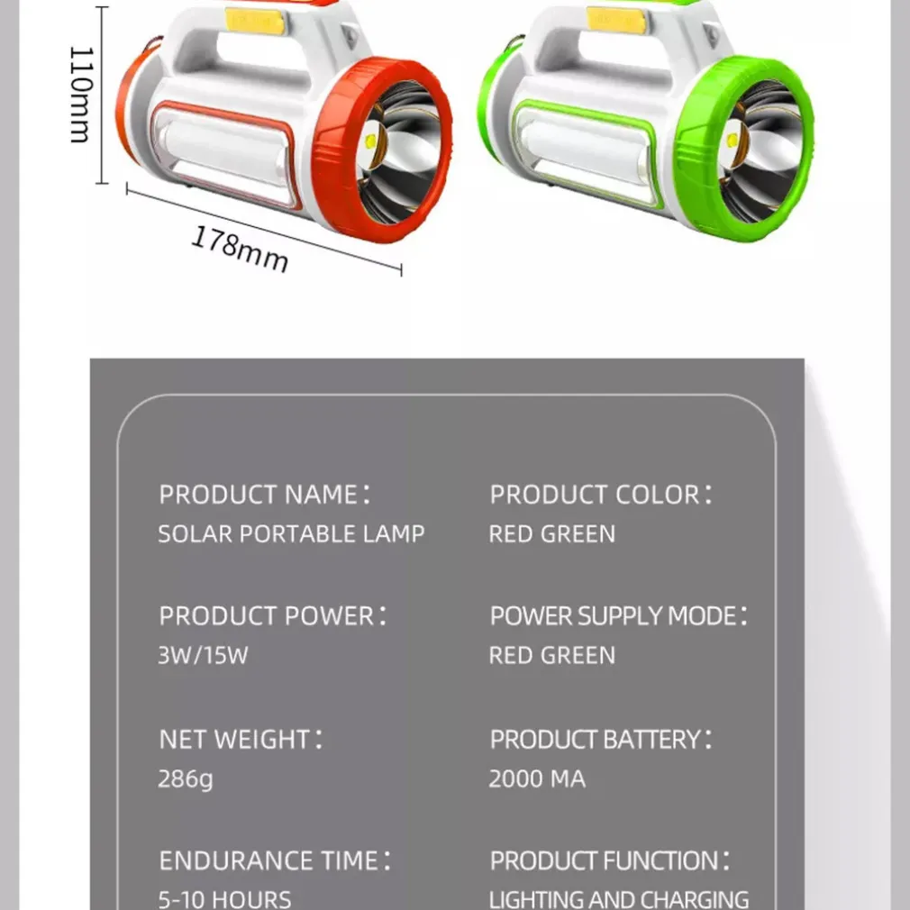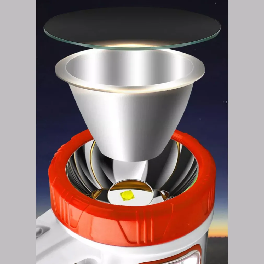 Torcia da campeggio con luce fortissima a LED. E’ dotata anche di una luce a 1 LED sul laterale per usarla come lanterna grazie al manico superiore. Utile come luce di emergenza in garage o in giardino. Dispone di una batteria interna da 2000mha da poter utilizzare anche come powerbank. Ricaricabile al sole, impermeabile IP65